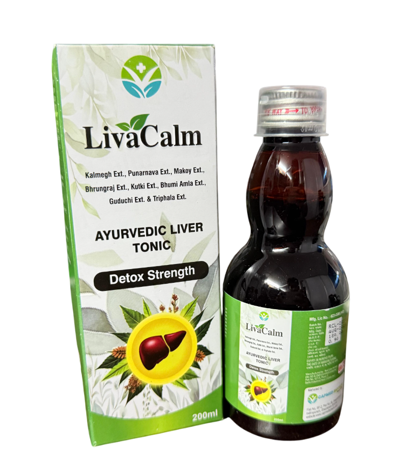 Livacalm is a natural liver care formulation enriched with powerful Ayurvedic herbs like Kalmegh, Punarnava, Makoy, Bhringraj, Kutki, Bhumi Amla, Guduchi, and Triphala extracts. These time-tested herbs work together to detoxify the liver, promote regeneration of liver cells, and improve digestion and metabolism. Kalmegh and Kutki act as natural hepatoprotectives, while Punarnava and Makoy reduce swelling and improve liver function. Bhumi Amla and Guduchi help in boosting immunity, and Triphala supports gut health. Livacalm is ideal for managing fatty liver, jaundice, sluggish digestion, and liver weakness caused by alcohol or medicines. It is a safe, herbal approach for maintaining long-term liver health and overall wellness.