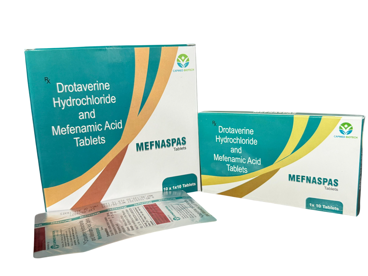 Mefnaspas Tablets combine Drotaverine and Mefenamic Acid, providing effective relief from pain and spasms. Each tablet contains 80 mg of Drotaverine, an antispasmodic that helps to relax smooth muscles, and 250 mg of Mefenamic Acid, a nonsteroidal anti-inflammatory drug (NSAID) that reduces inflammation and pain. Mefnaspas is particularly useful for treating conditions like dysmenorrhea (painful menstrual cramps), abdominal pain, and other spasmodic pains. The combination ensures comprehensive pain relief by targeting both the pain and the muscle spasms that often accompany it.